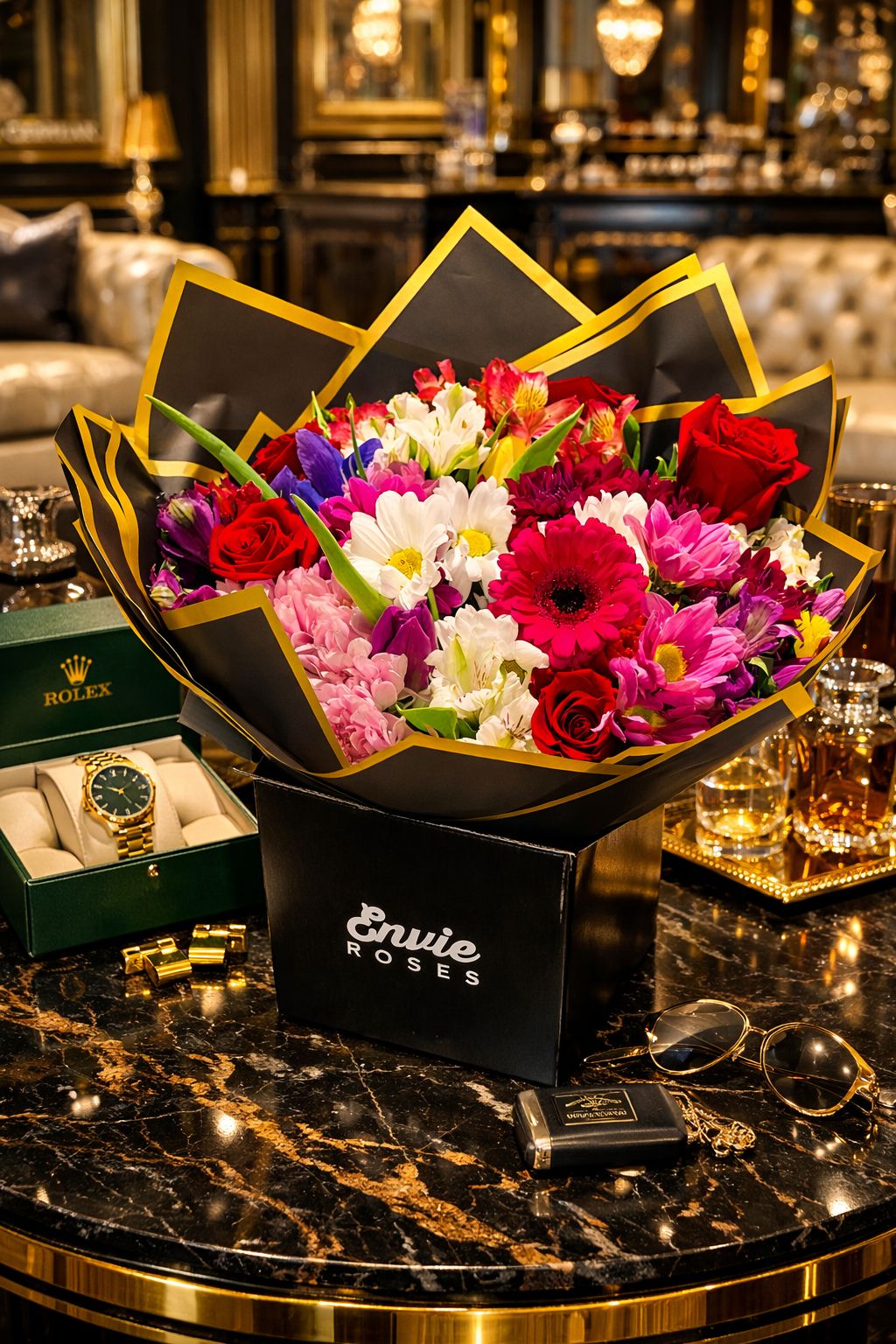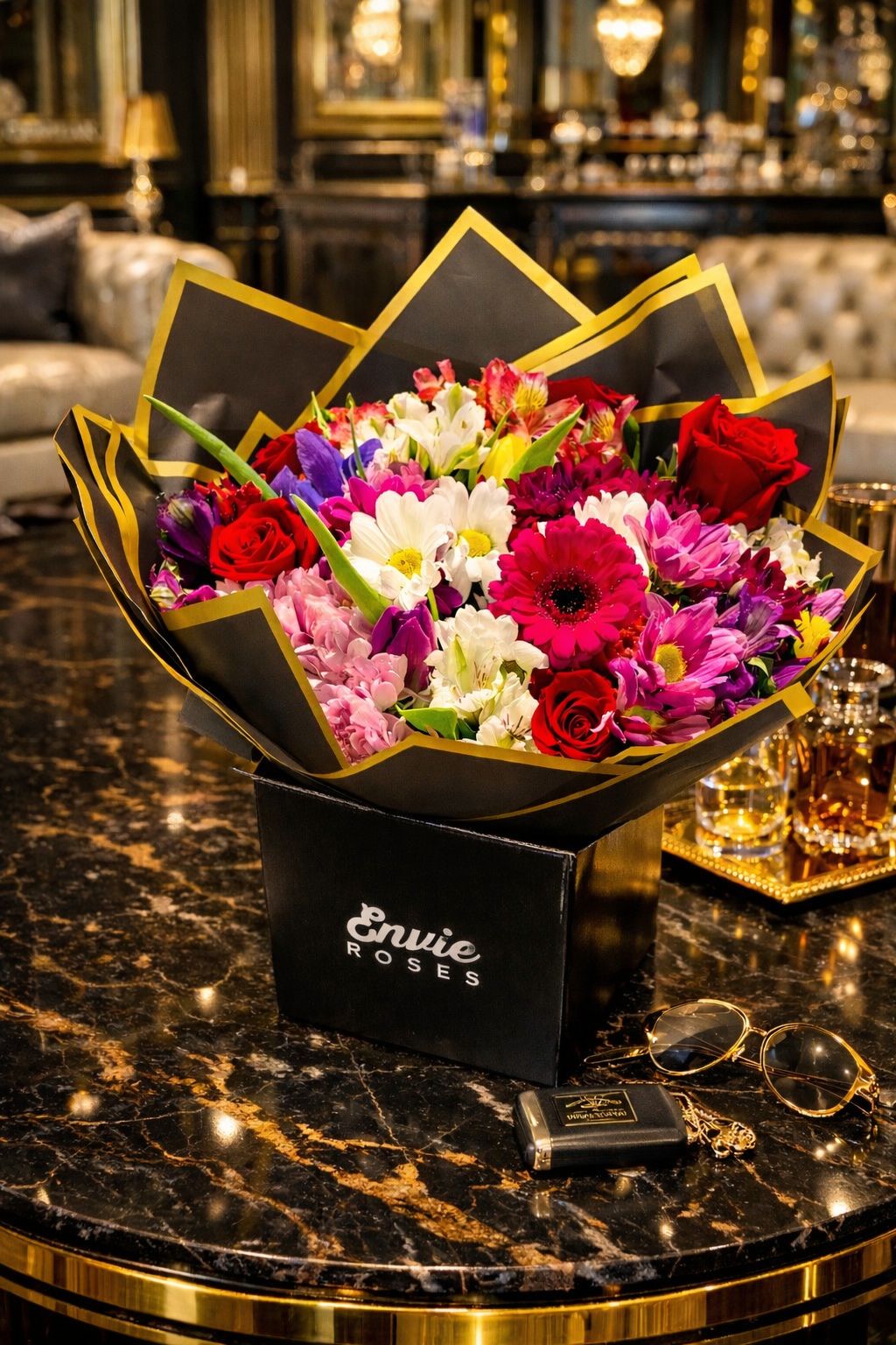 Wrapped in elegant black and gold couture-style floral paper, the bouquet is designed to impress from the very first glance. Whether you’re celebrating love, marking a milestone, or surprising someone special, this statement arrangement delivers the feeling of an opulent luxury gift experience.